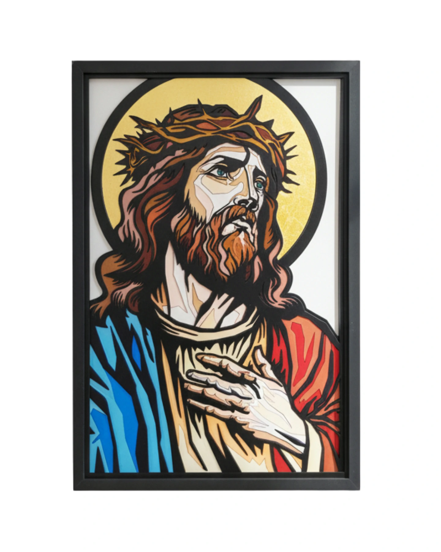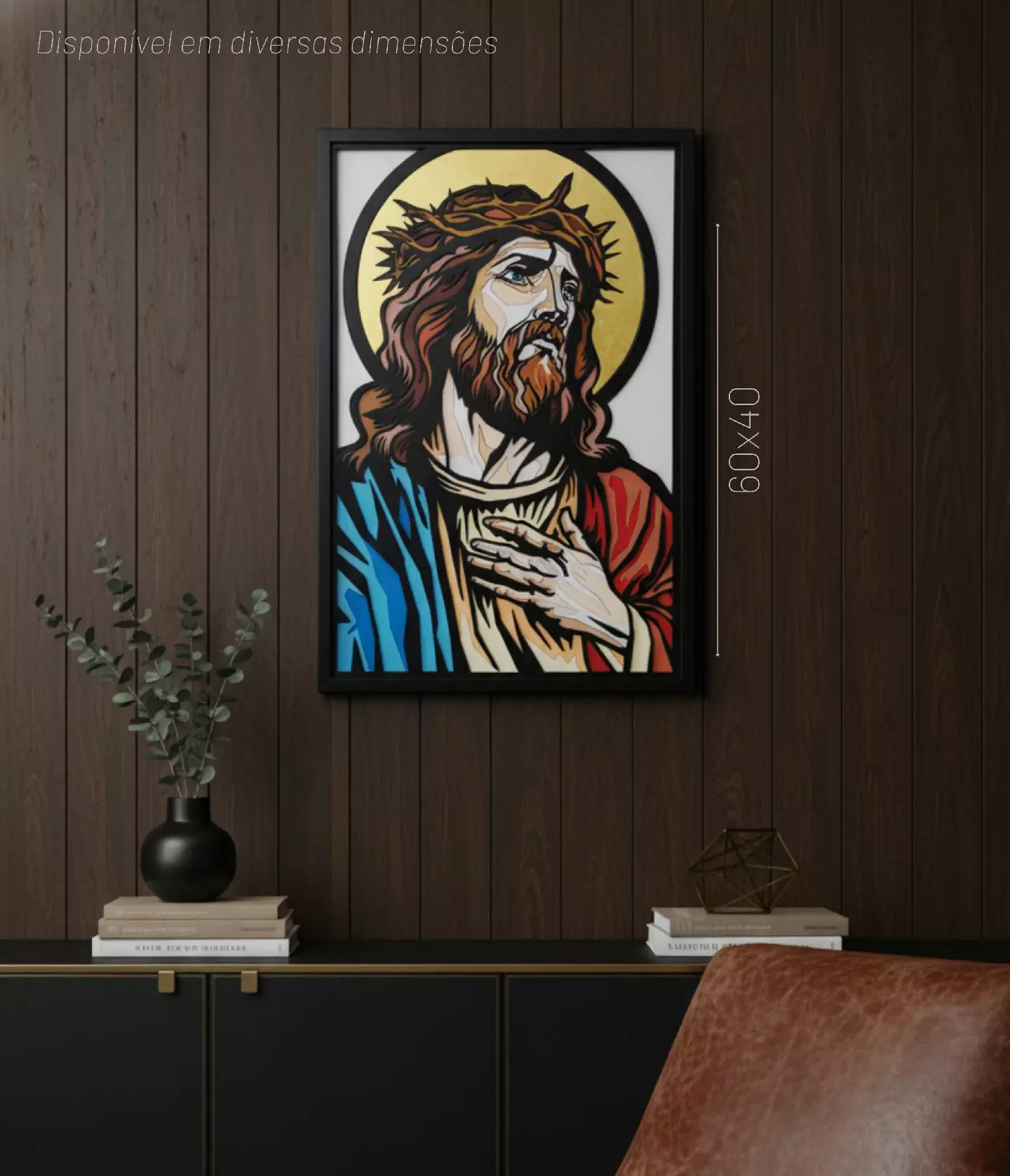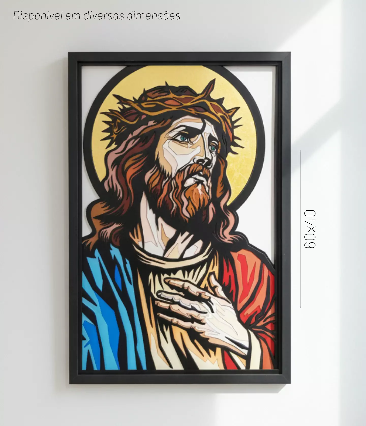Canudim retrata Jesus em linhas firmes, cores intensas e um fundo dourado que remete ao divino. O olhar elevado, a coroa de espinhos e a mão sobre o peito criam uma atmosfera de devoção, enquanto o estilo pop urbano dá nova vida à iconografia clássica.