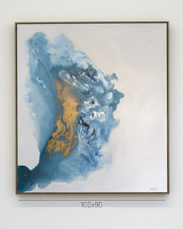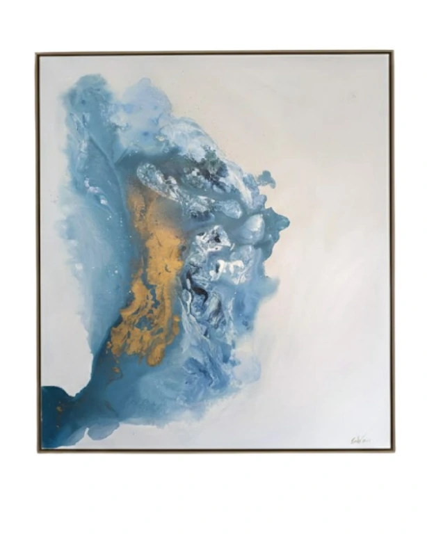 A técnica em acrílica sobre tela revela um domínio sofisticado das transparências. As tonalidades de azul, que variam do cerúleo profundo ao celeste quase etéreo, fundem-se em camadas que evocam tanto a vastidão do oceano quanto a imensidão do céu. No coração dessa massa orgânica, o dourado ressurge não apenas como adorno, mas como o elemento condutor — a luz que guia os elementos de volta à sua origem.
