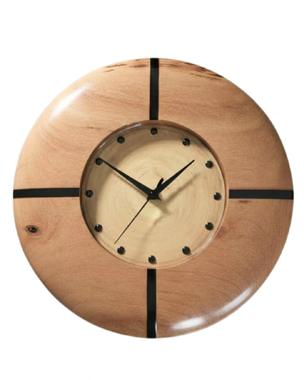 Dualidade Cromática e Tátil: O contraste entre o tom claro e quente da madeira torneada e o negro profundo das incisões em resina cria uma dinâmica de luz e sombra. O centro da peça, também em madeira clara, destaca o movimento dos ponteiros escuros, garantindo uma legibilidade absoluta.