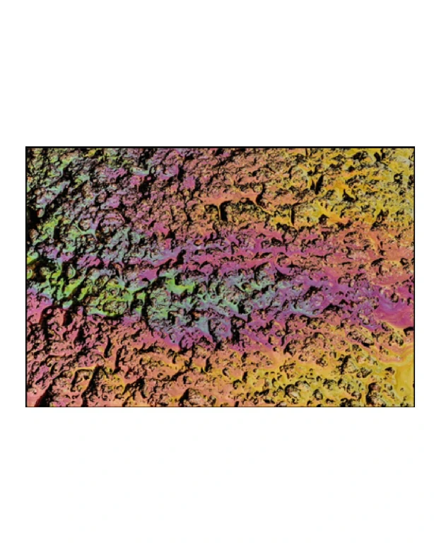 A obra revela uma superfície em constante transformação, onde cor e textura se organizam de maneira orgânica. Com uma riqueza cromática que evoca a pintura abstrata, a composição é construída pela reação química e pelo acaso.