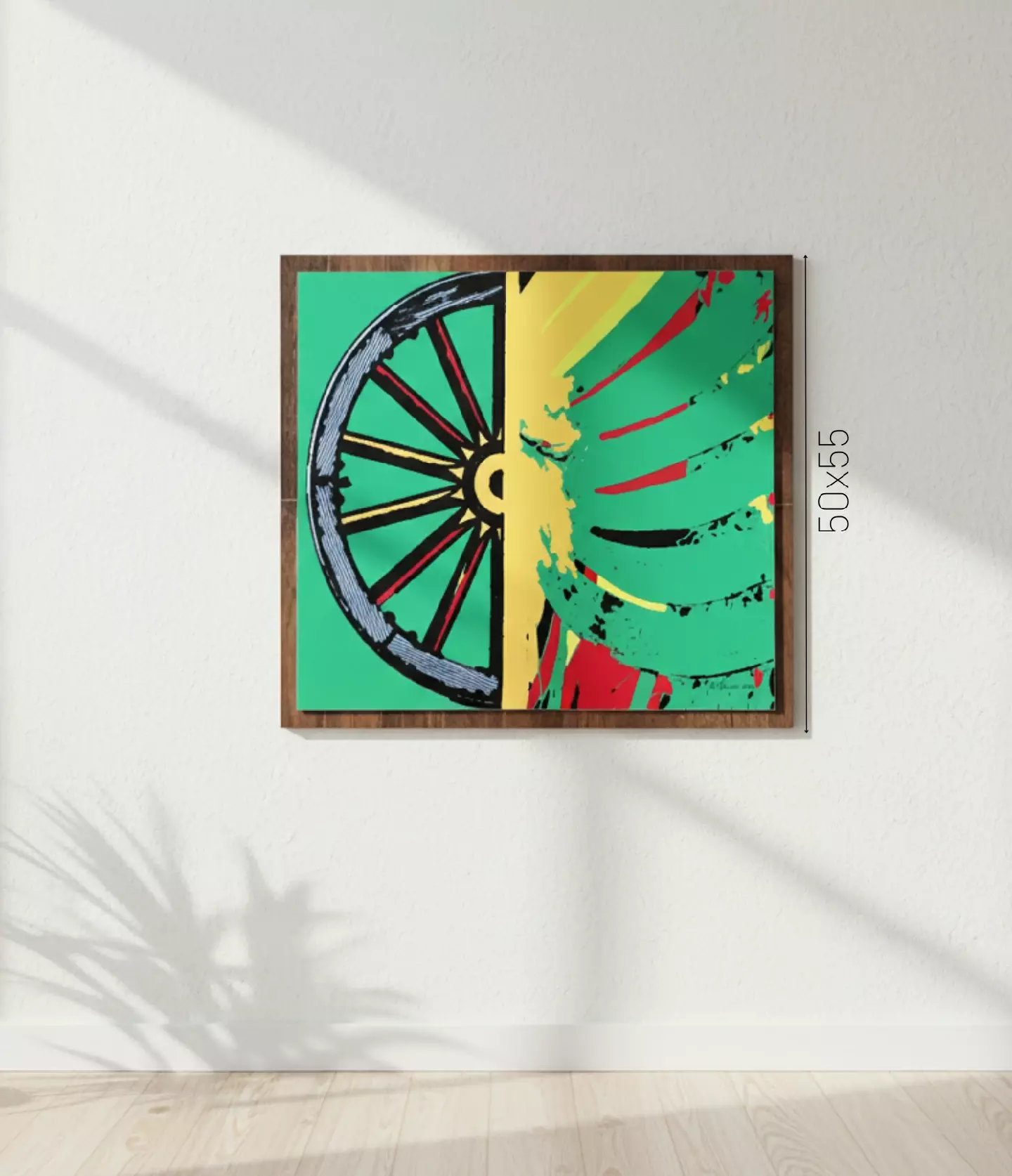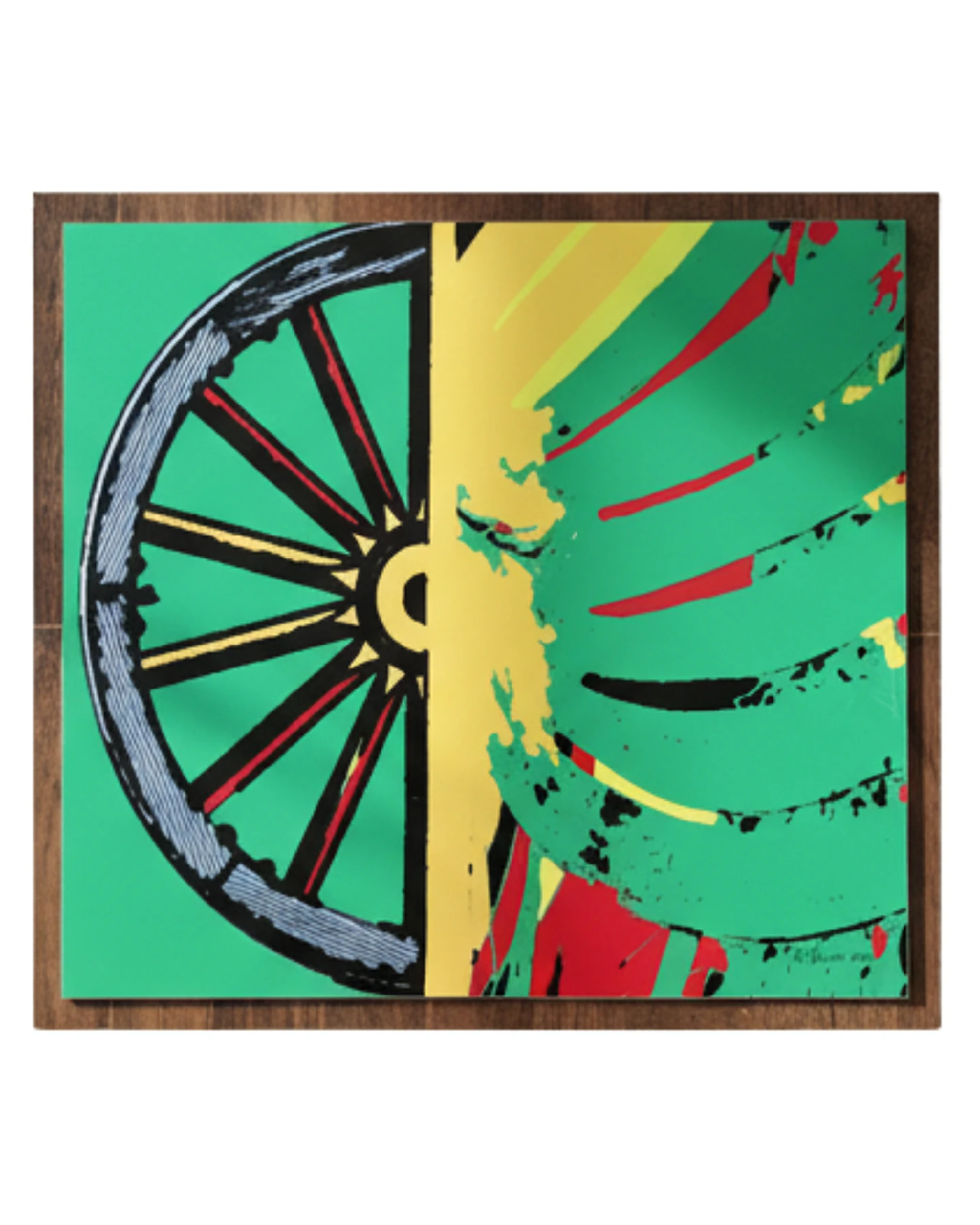 Caos e Dinamismo (Direita): A metade direita explode em uma desconstrução gráfica. A forma da roda é fragmentada e distorcida, parecendo estar em alta velocidade ou sob um forte impacto. O verde é mantido, mas as pinceladas e respingos em amarelo e vermelho transmitem uma energia explosiva, simbolizando a natureza imprevisível e o impacto da “fortuna” na vida.