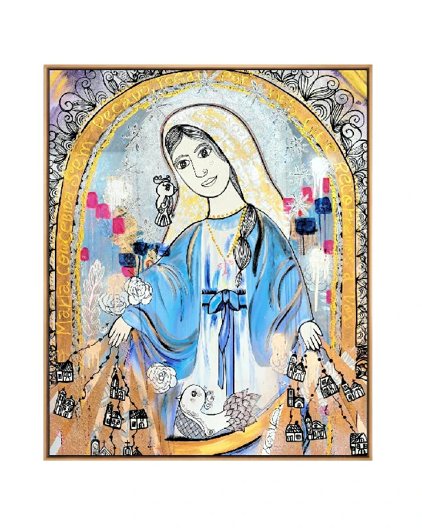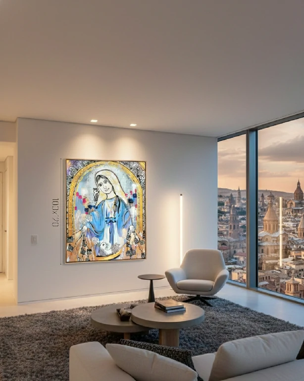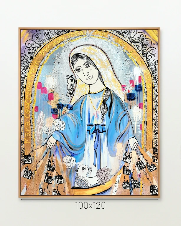 Na imponente tela “Rogai por Nós” (2020), a artista Erika Mello estabelece uma ponte entre o céu e a terra. Com dimensões de 100×120 cm, a obra não apenas preenche o olhar, mas instaura um espaço de oração e proteção no ambiente em que se encontra. O título, uma súplica direta e universal, ressoa através de cada detalhe da composição.