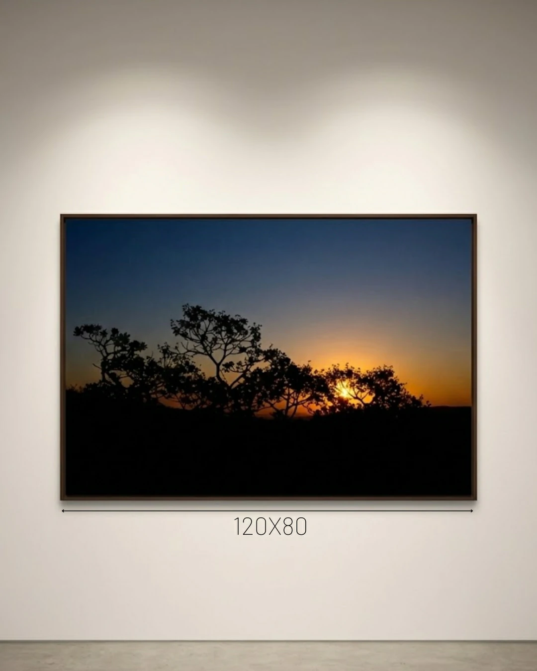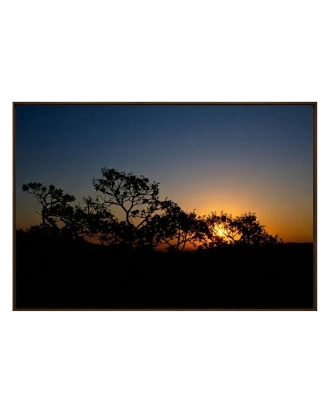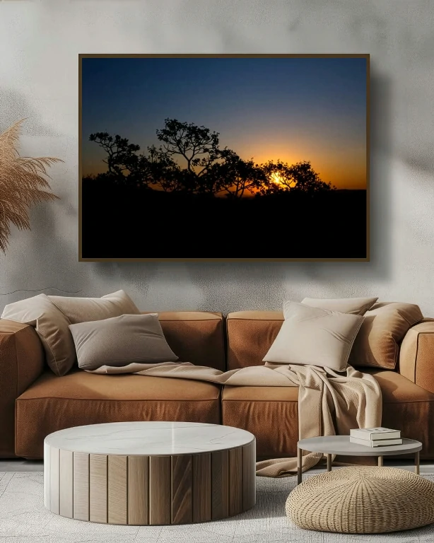 “Silhueta do Pôr do Sol” revela uma interação cativante entre os contornos escurecidos das árvores e o brilho quente e convidativo do sol poente. O céu azul profundo transita para suaves tons de laranja e dourado, criando uma atmosfera serena que incentiva a contemplação. Esta obra de arte incorpora a beleza tranquila da natureza ao entardecer, tornando-se uma adição ideal a qualquer espaço, enriquecendo sua decoração com um toque de elegância pacífica.
