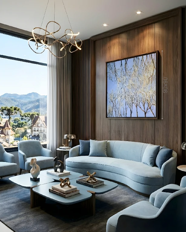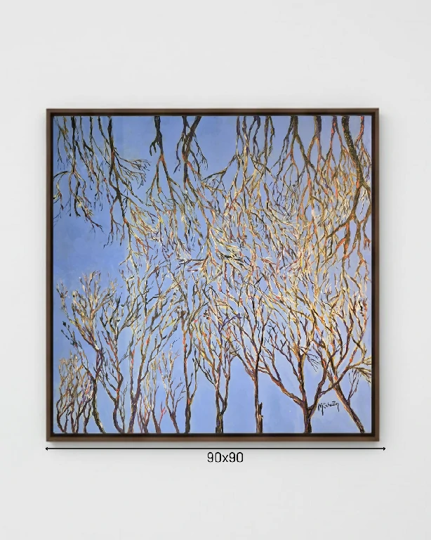 A Paleta de Cores: O uso do azul evoca o ar gelado e a clareza típica dos dias de inverno, servindo como o palco perfeito para que os tons terrosos e os toques sutis de luminosidade nos galhos ganhem protagonismo.