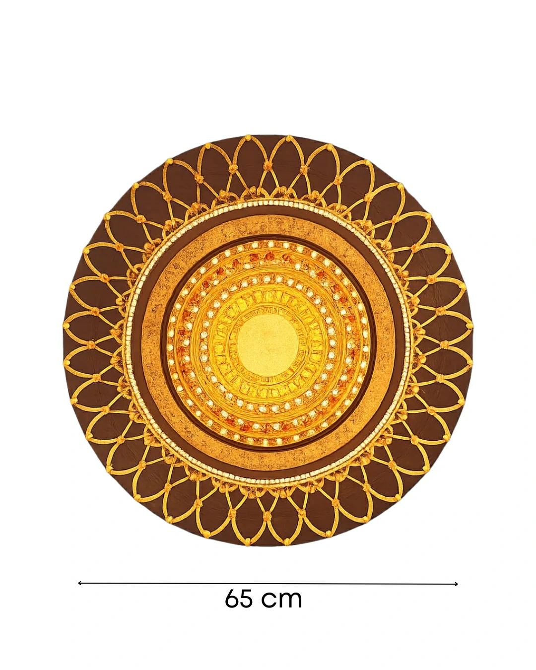 Folha Metalizada e Envelhecimento: O centro é um núcleo de luz pura, criado com folha metalizada. À medida que os círculos se expandem, a artista aplica técnicas de envelhecimento que dão à peça um aspecto de “ouro antigo”, equilibrando o brilho novo com a pátina do tempo.
