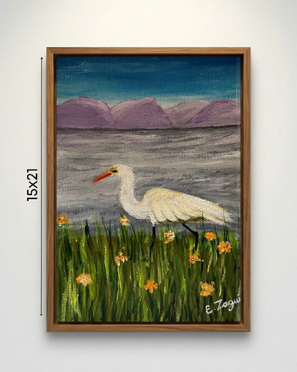 A tela é protagonizada por uma garça branca, figura que na arte frequentemente simboliza a vigilância, a calma e a pureza. A ave atravessa um campo de vegetação verdejante, pontuado por pequenas flores laranjas que trazem calor à composição fria do fundo.