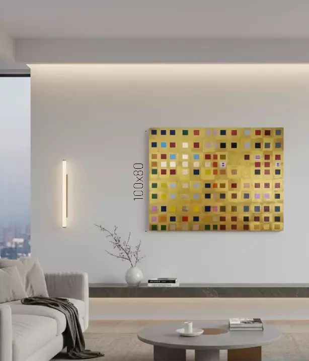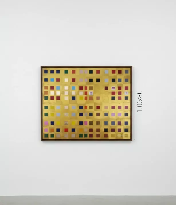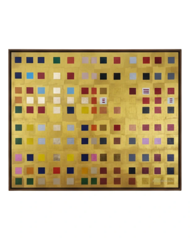 Nesta tela, Zanforlin utiliza uma grade rigorosa de quadrados coloridos dispostos sobre um fundo de ouro metálico vibrante. A precisão da forma geométrica sugere uma abordagem sistemática, científica e de dados— um contraste intencional com a fluidez da natureza.