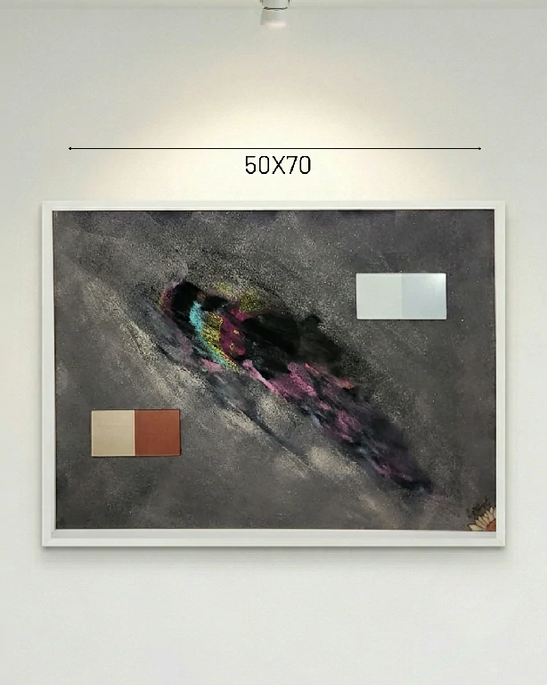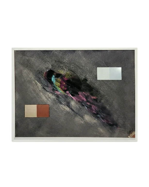 Com uma energia cinética notável, Speed Racer utiliza a técnica mista para evocar a sensação de movimento e velocidade. O fundo escuro e texturizado serve como o vácuo onde uma explosão central de cores — roxo, azul e amarelo — se desloca diagonalmente. A inserção de blocos geométricos em tons neutros atua como pontos de ancoragem visual, equilibrando a força gestual da composição.