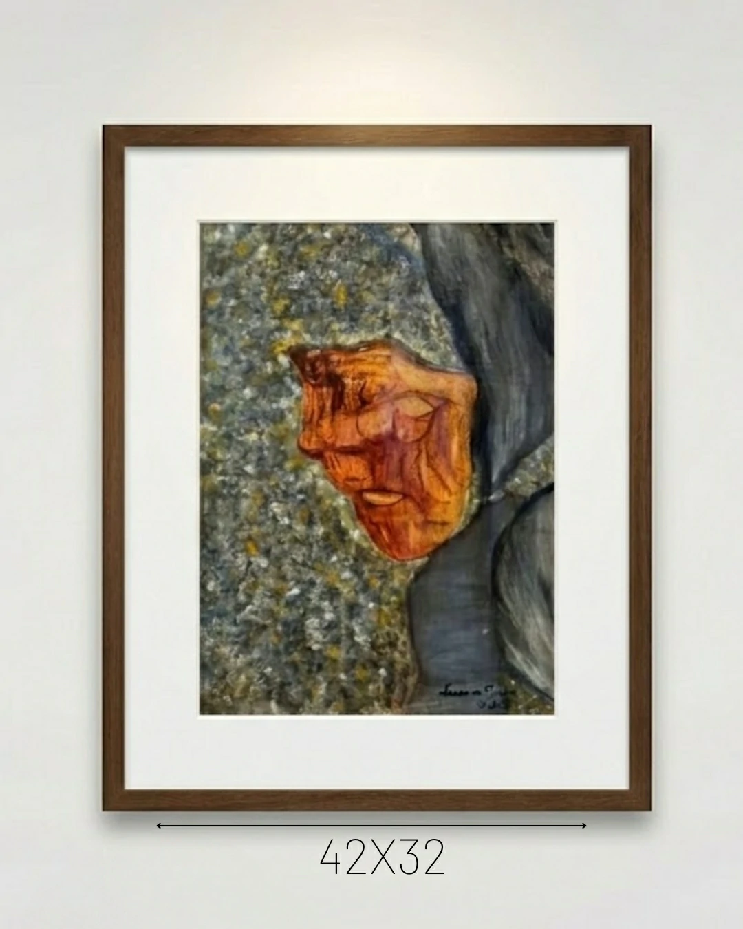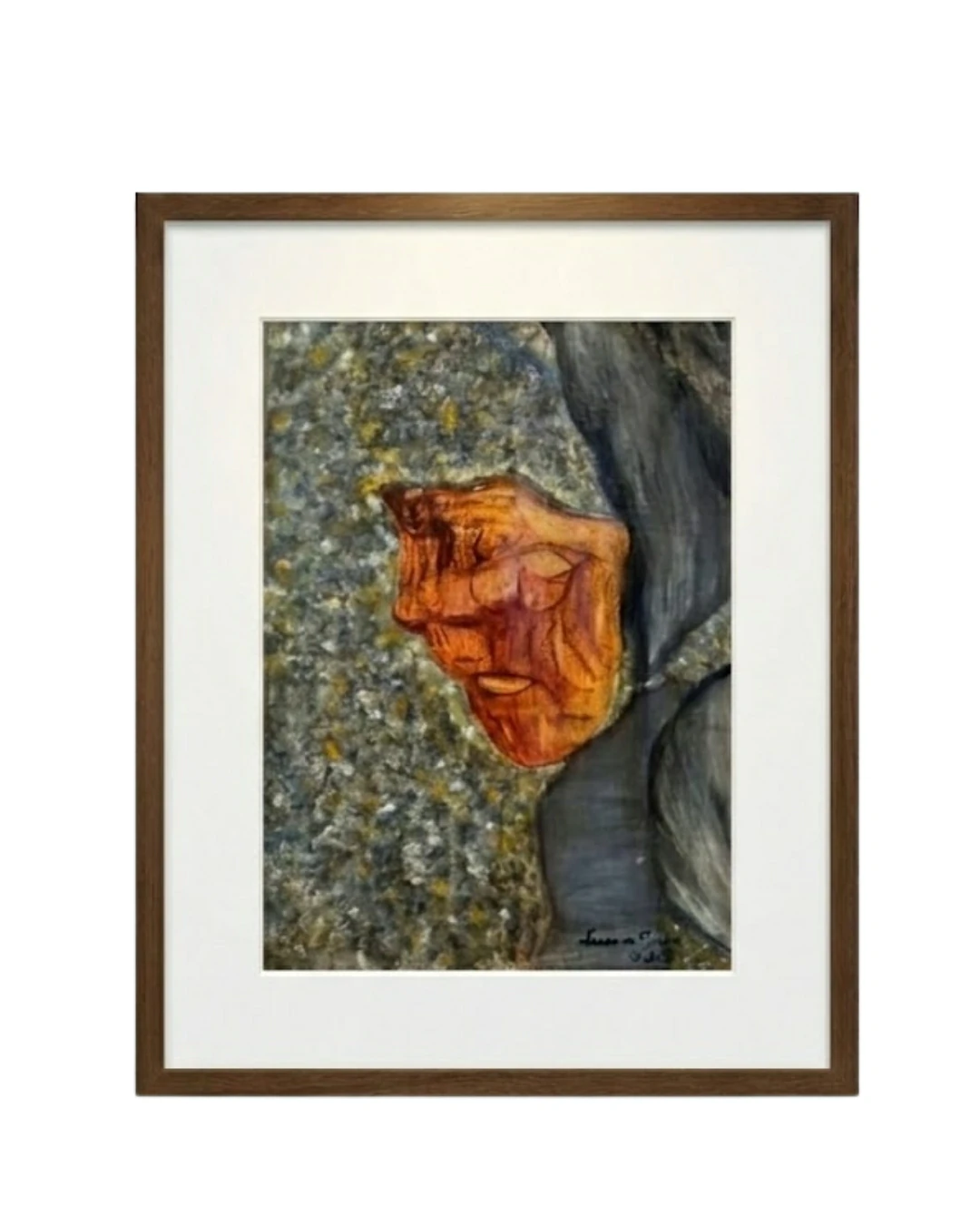 Nesta pintura, a artista explora a dualidade entre o estático e o vibrante. O fundo, trabalhado em tons de cinza e grafite com uma textura que remete ao granito ou à pedra bruta, serve como um palco austero para o protagonista da obra: uma forma central em tons de ocre e siena que parece pulsar.