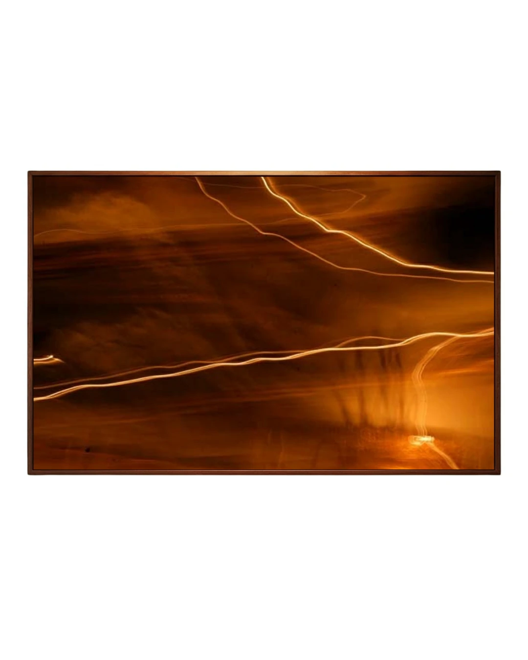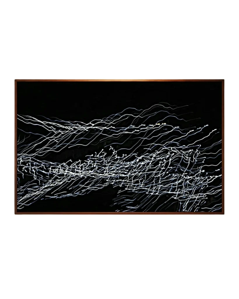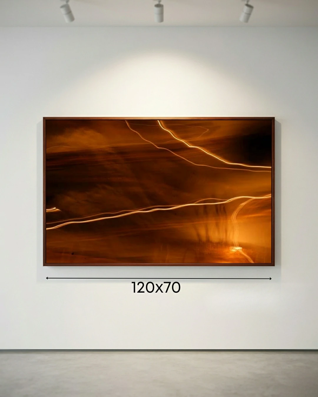 A obra “Traços de Luz” (120×70 cm) é a tradução visual da sofisticação. Através da técnica de longa exposição, Ronaldo Câmara transforma a luz em fios de ouro que parecem flutuar sobre uma superfície aveludada. Pela sua paleta de cores quentes e sóbrias, esta peça em canvas é ideal para ambientes que buscam um toque de luxo discreto e contemporâneo, harmonizando-se perfeitamente com materiais como madeira, couro e metais nobres. Uma presença marcante que define a identidade de um espaço.