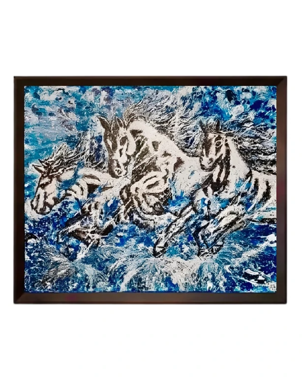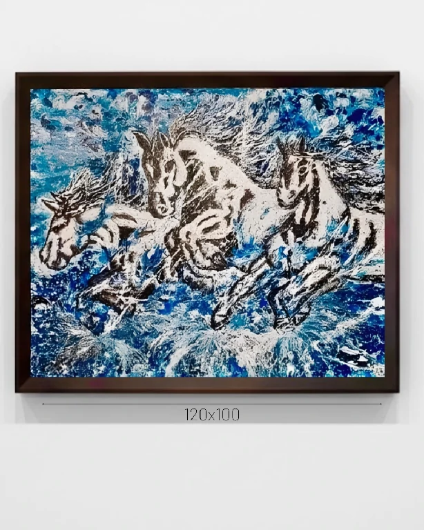• Profundidade Cromática: O fundo, dominado por nuances intensas de azul e texturas orgânicas, evoca tanto a liberdade do céu quanto a força das águas. Essa atmosfera etérea faz com que os cavalos pareçam surgir de uma explosão de energia elemental, reforçando o caráter quase mitológico da composição.