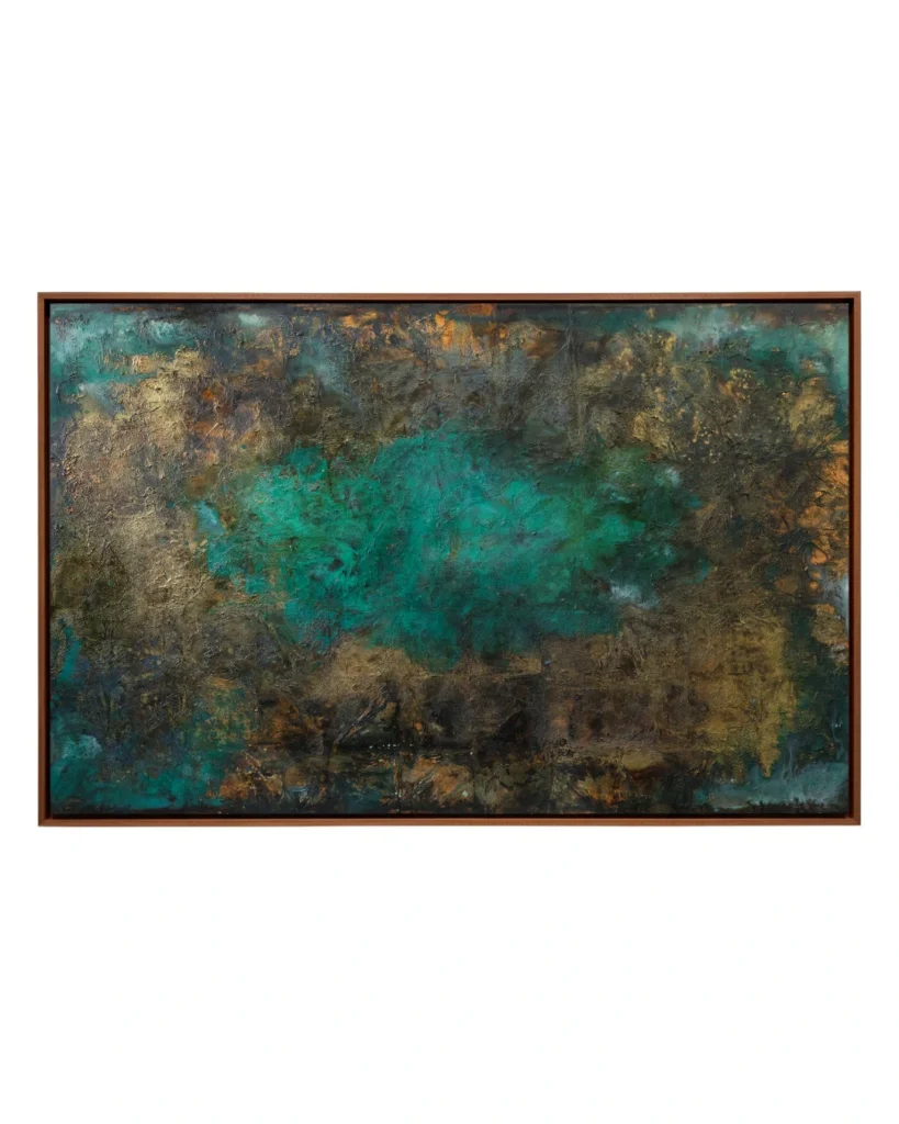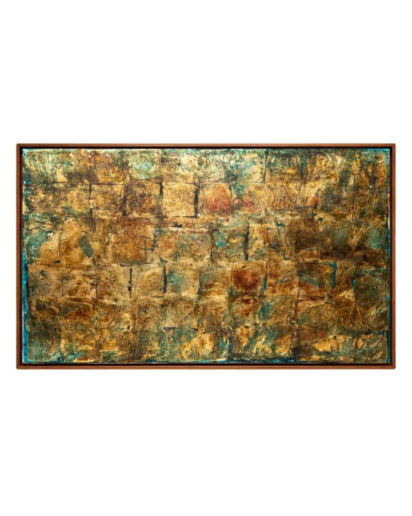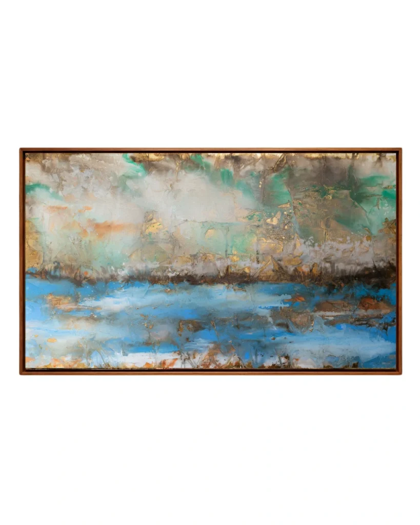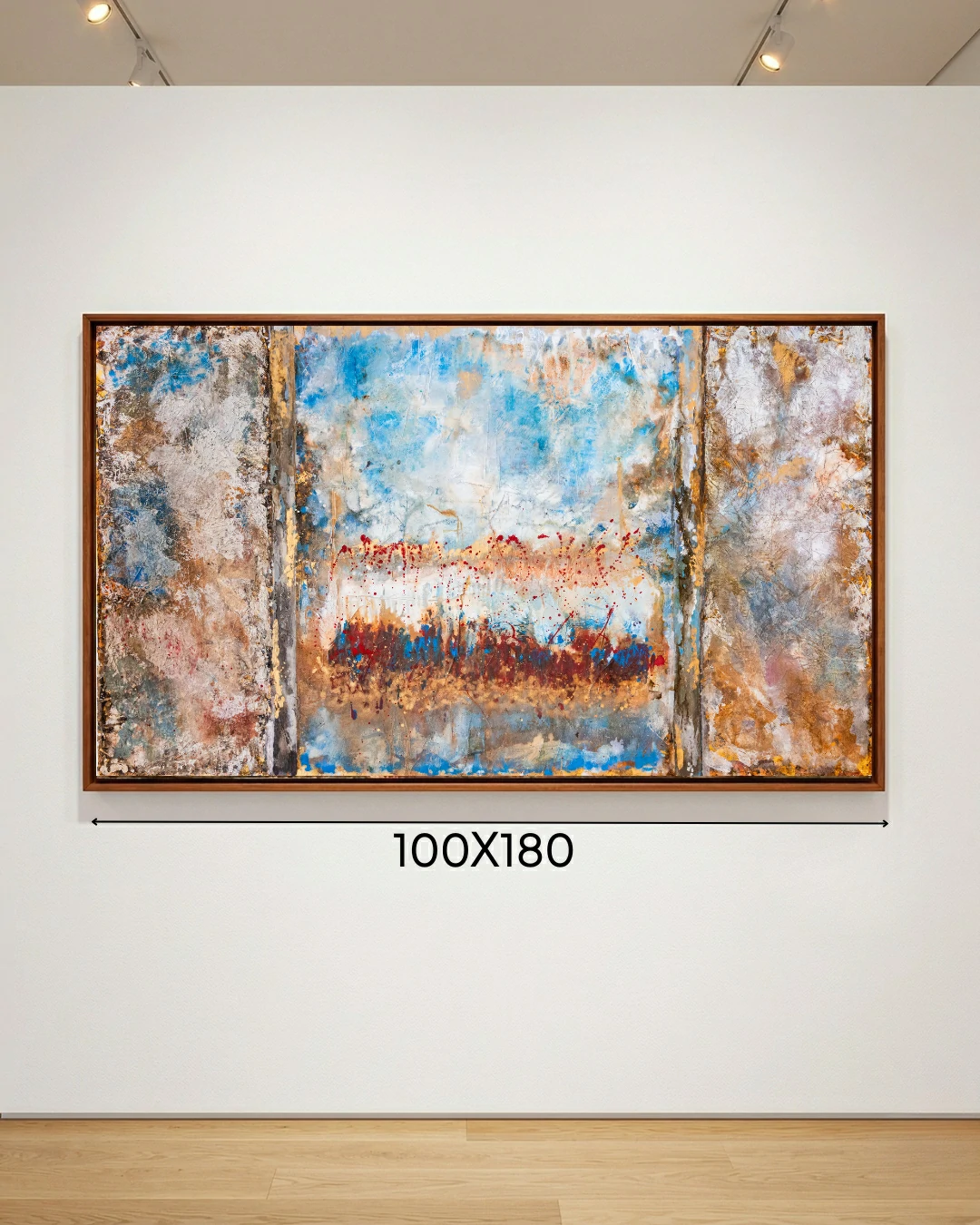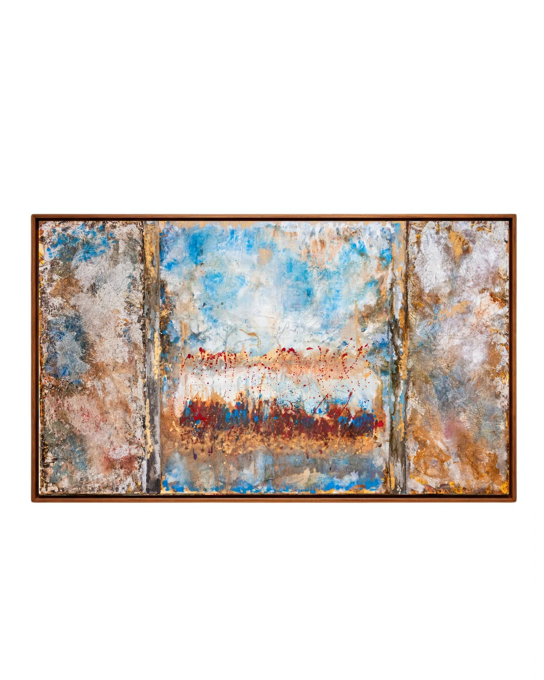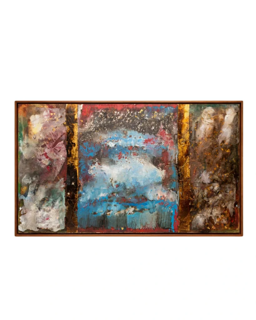As seções laterais, com suas texturas terrosas e oxidações douradas, funcionam como colunas que emolduram um centro etéreo, onde o azul celeste e o branco predominam, sugerindo uma janela para o infinito ou uma clareira de serenidade. O uso pontual do carmesim no horizonte central atua como um “pulso” cromático, conferindo vitalidade e uma necessária tensão visual que impede que a obra seja puramente contemplativa, tornando-a provocativa.