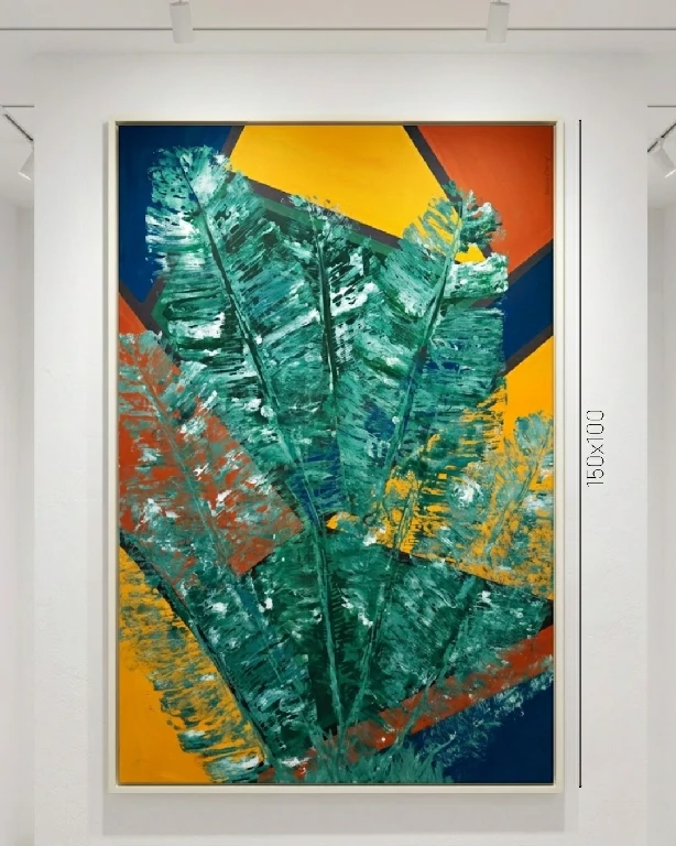Em “Tropicaliente”, a artista Adriana D’Ferraz apresenta uma obra de impacto imediato, onde a natureza não é apenas observada, mas reinterpretada através de um prisma vibrante e estruturado. Com grandes dimensões (150x100cm), a tela captura a essência da luz e da vegetação tropical sob uma ótica contemporânea e arrojada.