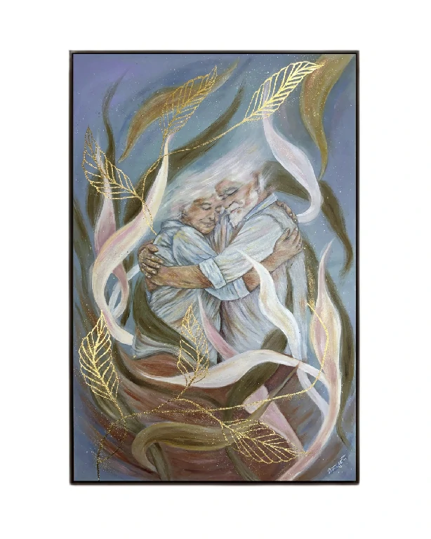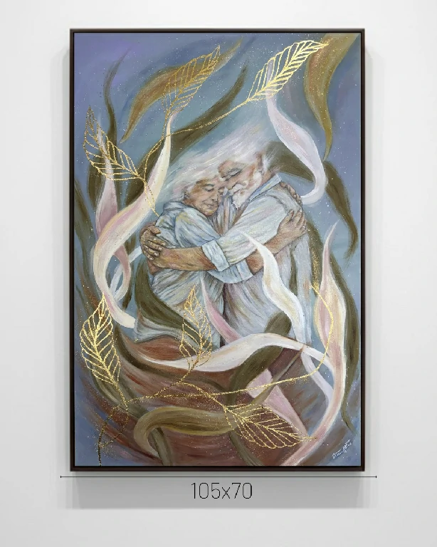 O coração da obra é ocupado por um abraço: o entrelaçar de um casal maduro, pintado a óleo com uma suavidade que evoca memórias e ternura. O uso do óleo permite uma profundidade na pele e nas expressões que contrasta harmoniosamente com o fundo em acrílico. Este cenário é composto por formas orgânicas e fluidas, semelhantes a folhas e ventos, que parecem envolver e, ao mesmo tempo, carregar os protagonistas em um fluxo inexorável.