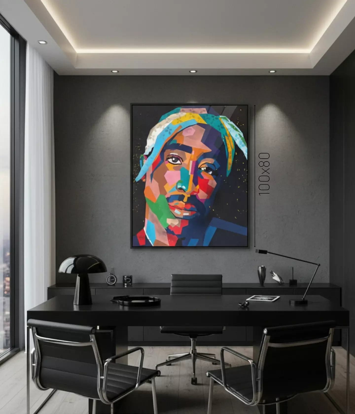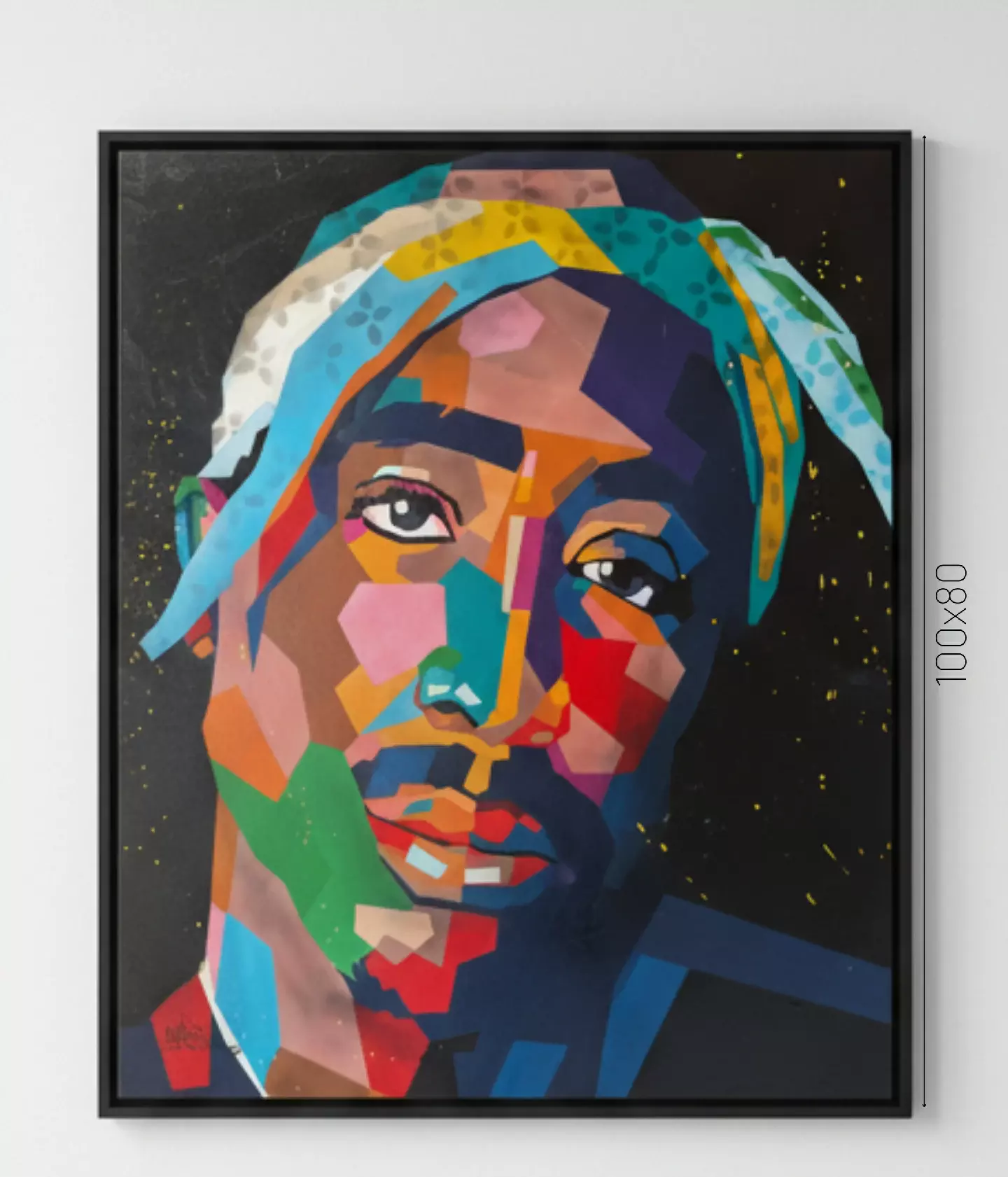 O rosto é construído por planos de cor vibrantes que “esculpem” a expressão. A paleta de cores, que foge do realismo, serve para realçar a atitude e a intensidade do artista. Repare como, mesmo fragmentado, o olhar de Tupac se mantém como o ponto focal absoluto da tela.